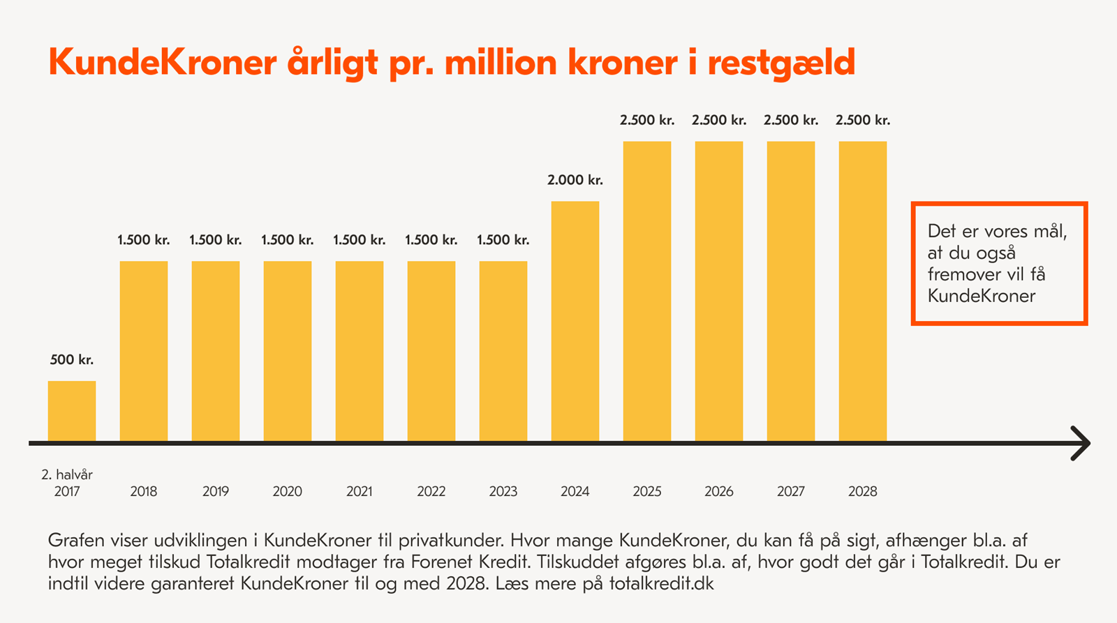 Det er indtil videre besluttet, at der gives rabat frem til 31. december 2028. Men det er Totalkredits mål, at du også fremover vil få KundeKroner – og Totalkredit har givet KundeKroner hvert år siden 2017.
